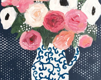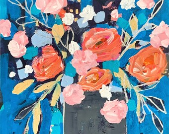 Original Painting - "2020 Floral in Blue Pot" - Mixed Media on Canvas Panel - 8" x 10"