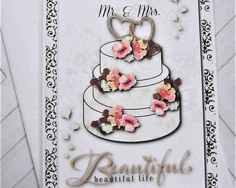 Wedding Card, Congratulations!, Mr. & Mrs., Wedding Cake, Hearts and flowers, Bride and Groom, Wedding Celebration Card