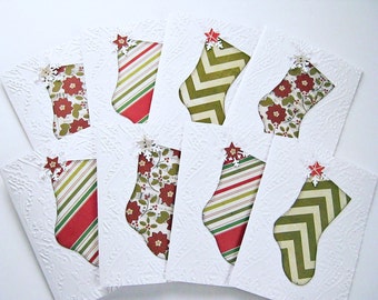 Christmas Stocking Note Cards, Holiday cards, Seasonal Card, Embossed note card, Christmas Stocking, handmade, Christmas gift, red and green