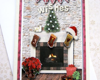 Holiday Wishes Christmas Card, Merry Christmas, Happy Holidays, Seasonal Card, digital, dimensional, Christmas Tree, Stockings, poinsettia