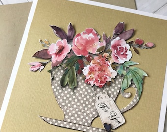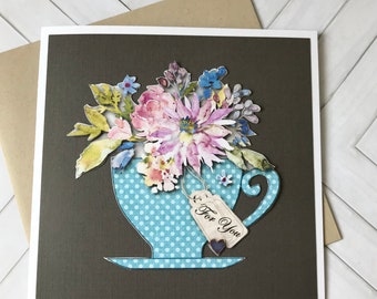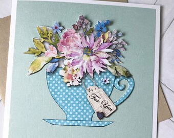 Teacup card, Thinking of you, Just a note, Blank card, All Occasion Card, watercolor flowers