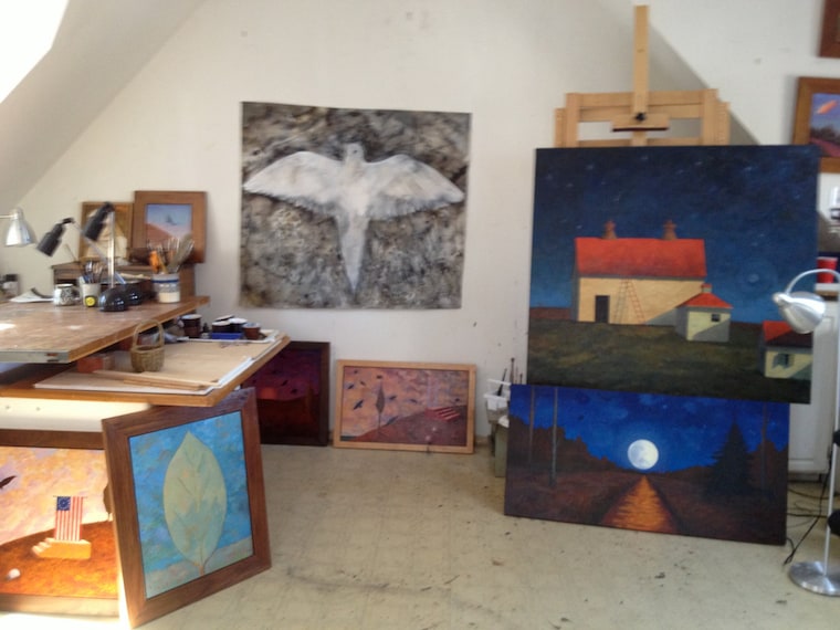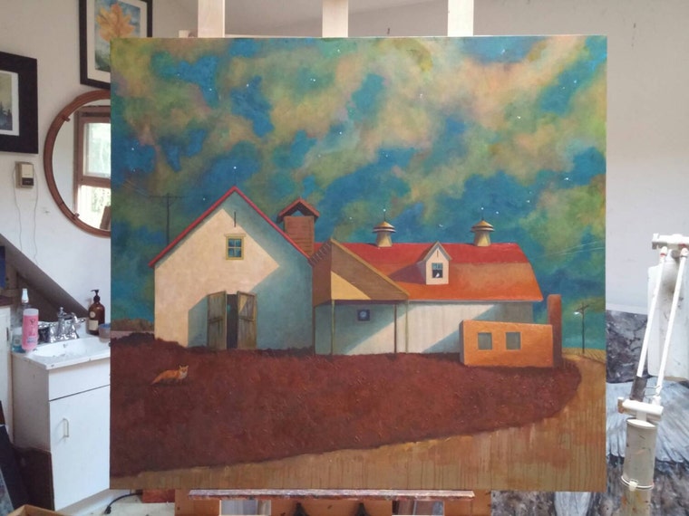 The main themes I focus on in my work are based on nature and spirituality. I feel strongly about protecting the environment and the health of all animals on land and sea. I grew up on land that was my grandparents farm and have loved painting barns. This subject matter continues to interest me. My barns are imagined rather than actual locations. I believe painting surreal places is like creating my own movie set. We are not alone in the universe and the mystery of other life in the universe also influences my paintings.