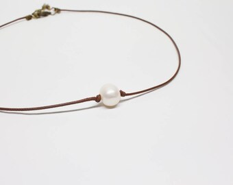 Single Freshwater Pearl Necklace - korean waxed cord brown or black, small pearl necklace choker, gift inspiration