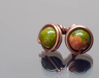 Copper and Unakite Earrings - 6mm small wire wrapped earring studs - earthy green and peach pink unakite petite earrings set summer outdoors