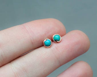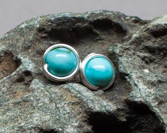 Real Turquoise Stud Earrings - 5mm sterling silver and turquoise wire wrapped earrings, small dainty, genuine turquoise, gift for her