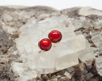 Red Coral and Gold Stud Earrings - 5mm tiny wire wrapped earrings - real coral beads with 14k gold filled, small dainty studs, jewelry gift