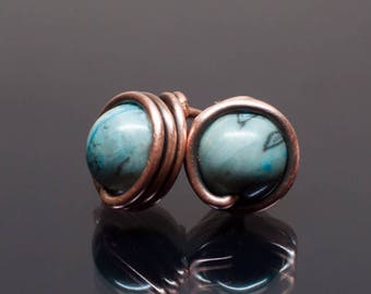 Copper Turquoise Stud Earrings - 4mm tiny wire wrapped earrings - earthy turquoise magnesite petite earrings, summer outdoors gift