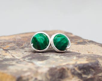 Silver and Malachite Earrings - 6mm small wire wrapped earring studs - shades of green malachite petite earrings faceted set summer outdoors
