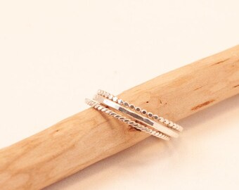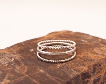 Silver Ring Set - Three Sterling Silver Rings - Triple Texture Set of Stacking Rings - Hammered ring, bead ring, twist ring- pattern rings