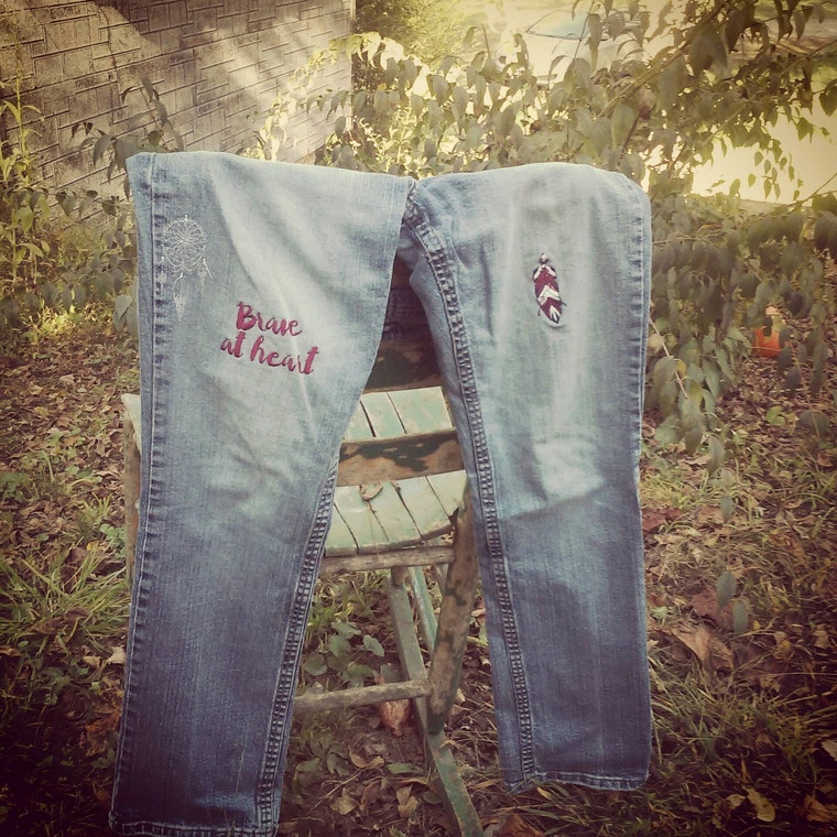 Playing with new toys. Brave at heart jeans with feather and dreamcatcher 💞💞💞💞💞💞 -