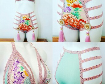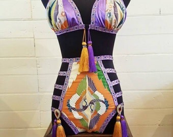 Having travelled extensively through the Orient in her youth Lisa loves to design some of her pieces with exquisite fabrics such as vintage kimono silk and opulent Indian embellishments. She also has a penchant for the 1920's and 30's MGM showgirl era ,and the more risqué costuming from the early 1900's such as adorned by Theda Bara.