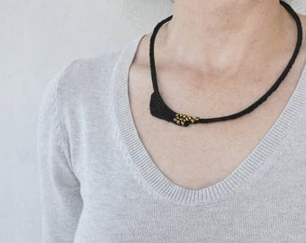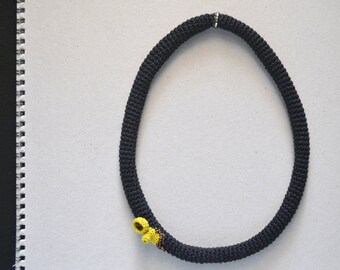 Black statement necklace, contemporary jewelry, crochet necklace, black rope necklace with detail in mustard, simple/modern/fashion necklace