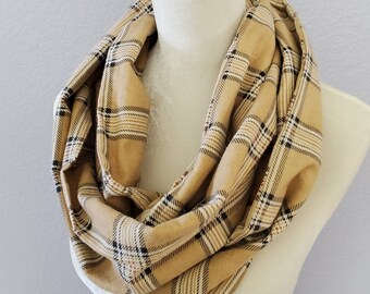 Hidden Pocket Infinity Scarf - Tan & Brown Plaid - Cotton Flannel - Teacher Gift - Stocking Stuffer - Gift Exchange - Perfect for Travel