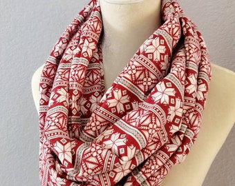 Hidden Pocket Infinity Scarf - Red Fair Isle Stripe - Cotton Flannel - Teacher Gift - Stocking Stuffer - Gift Exchange - Christmas