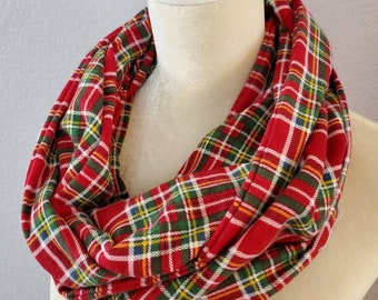Hidden Pocket Infinity Scarf - Red and Green Plaid - Cotton Flannel - Teacher Gift - Stocking Stuffer - Gift Exchange - Christmas