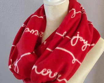 Hidden Pocket Infinity Scarf - Joy, Believe, Merry, Peace on Red - Cozy Fleece - Teacher Gift - Gift Exchange - Perfect for Travel