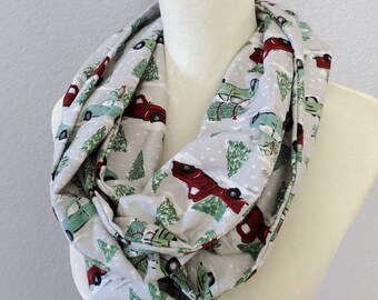 Hidden Pocket Infinity Scarf - Christmas Tree Trucks - Cotton Flannel - Teacher Gift - Stocking Stuffer - Gift Exchange - Perfect for Travel