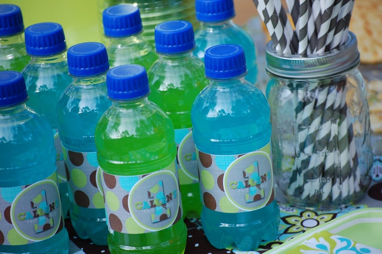 Colorful drinks can be customized with printable bottle labels to add that one of a kind touch to your party. -