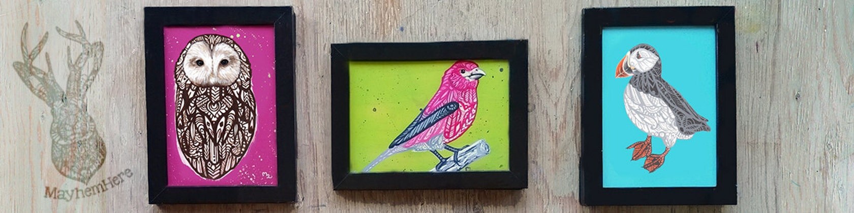Hello my name is Mallory and I am the artist behind Mallory Milke Art aka MayhemHere. Since I was young I had an artistic soul, I was the kid doodling in class or painting the walls of my room with the tiny acrylic set I recieved for christmas. I have always had an urge to add to what is already there with something interesting that draws attention. As I filled up the walls of my home with my own art, I had so many of my friends and family asking for their own that I decided I might as well go for it and see where it takes me. Four years later, tons of empty paint tubes and I’m here, working for myself and loving every minute of it. I get to stay home with my son and create fun, colorful paintings that I love.