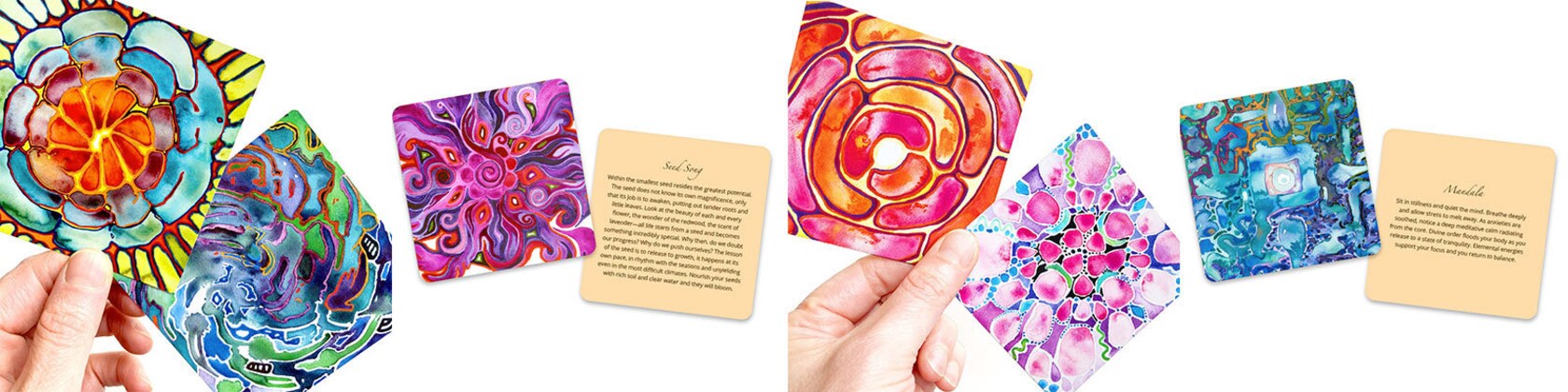 5 out of 5 starsI love these cards! They are beautiful with words on them for further insight or meditation. I really love their square shape, they are easy to handle and come in a box, beautiful cards beautifully presented, thought provoking. I love this deck 💜