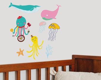 Reusable Fabric Wall Decals / Whale Jellyfish Octopus / Removable Wall Decals / Wall Art / Gift Ideas / Nursery Room / Home Decor