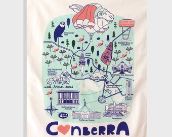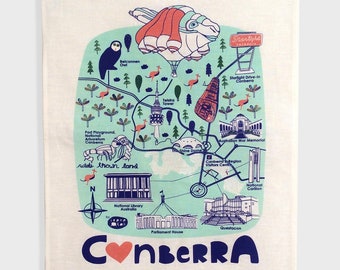 NEW 100% Cotton Screen Printed Canberra Map Tea Towel, Canberra, Souvenir, Cotton Tea Towel, Skywhale, Canberra Icons