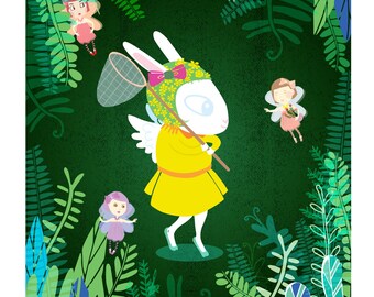 Fairies and Bunny / Tropical / Fantasy / Plant / Australian Nature / Green / Art Print / Home Decor / Giclee Print / Archival Art Print A4