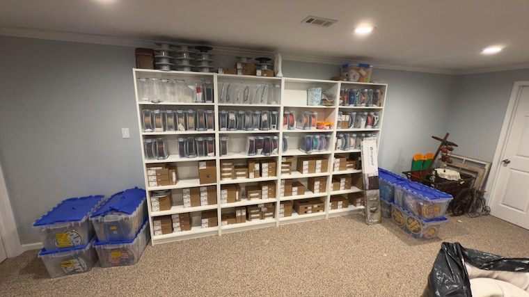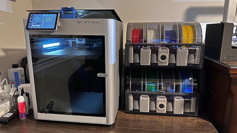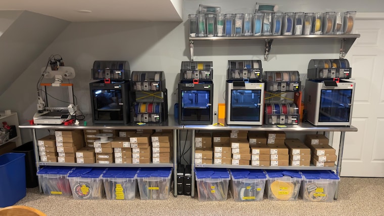 Some of my 3D printers, along with supplies and stporage for pre-printed plaques. -