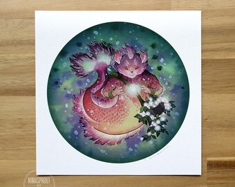Aquatic Spellcat with Flowers- Hand Embellished Print by Nicole Gustafsson