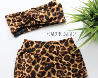Mini Leopard Turban Headband and Shorties Set - Baby Turban Headband - Bummies - Bloomers - Toddler Shorties - Big Bow Headband - Leopard