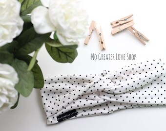 Gorgeous Black Pin Dots on Cream Headband - Turban Headband - Top Knot - Big Bow - Bow Headband - Baby Child Adult Sizes - Buy One Give One