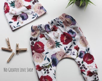 Fall Watercolor Floral Baby Set - Knotted Beanie and Matching Pants - Newborn to 12mo - Coming Home Outfit - Soft Knit Harem Pants