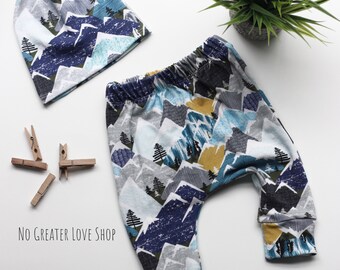Mountain Adventures Baby Set - Knotted Beanie and Harem Style Pants - Newborn through 12mo - Cozy Pants Set - All Profits to Missions