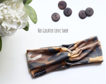 Mustard Camo Headband - Turban Headband - Big Bow Headband - Knotted Headband - Newborn to Adult - All Profits to Missions
