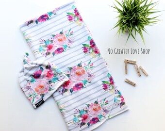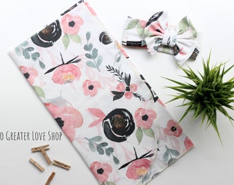 Watercolor Floral Swaddle Set - Big Bow Headband - Baby Swaddle Blanket - Baby Headband - Bow Headband - Baby Blanket - Swaddle - Baby Bow