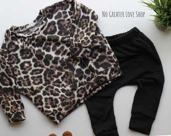 Leopard Dolman Oversized Sweater and Charcoal Skinny Harems - Oversized Sweatshirt - Leopard Print - Newborn to 5T - Fall Fashion