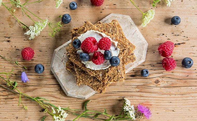 Summer delight. Knekkebrød with goat cheese, raspberries, and blueberries. -