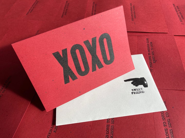 I also print small-batch letterpress greeting cards in a joyful exploration of form and color. I use vintage wood and metal type collections and small hand-operated letterpress equipment. I mix my own colors unique to each edition, and print the cards on fine linen paper paired with charming recycled brown envelopes.