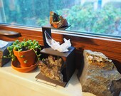 4 van 5 sterrenThis striking stand is a uniquely conceived/executed solution to typically seen varieties, in my favorite tint: black. Vertical orientation is appealing yet practical - holds multiple objects in a smaller footprint. Tiny ridges span across every surface of the material, a kind of heavier quality plastic. Pleasing tactile property. Rounded edges with raised barriers on lowest tier lend further appeal and structural integrity. The triangle insets are quite cool - versus typical rounded depressions - imbuing an additional edgy geometric attribute I like. They do hold cubes snuggly of smaller sizes as well. Top tier holder inset is smaller, so use for smaller objects. For reference, my larger bottom sphere measures 2 5/8" in diameter. Holds securely, with about a half-inch above it for clearance. Quite pleased overall. Yay Oregon.