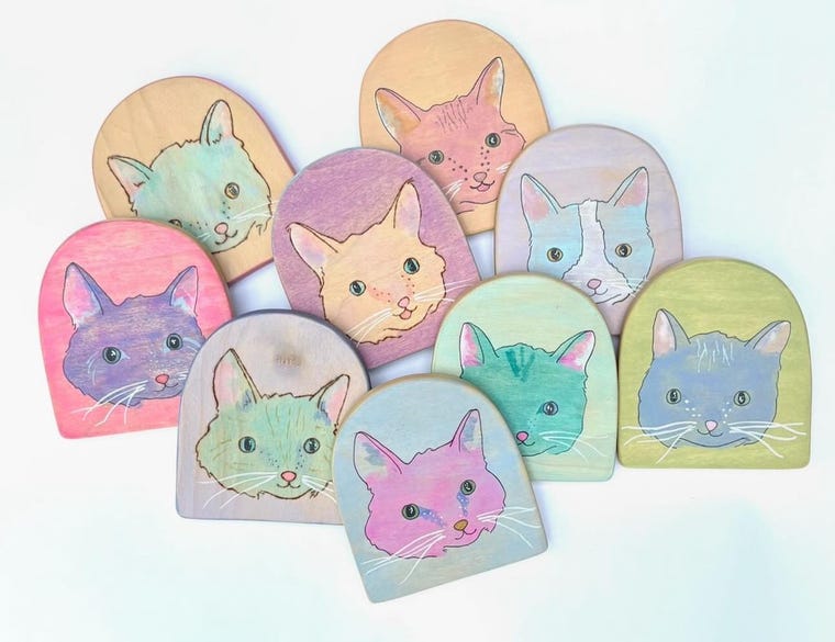 Recently I found a love for drawing and painting. It’s mostly cats - I just can’t stop drawing cats! I’ve started turning some of my sketchbook drawings into wooden wall art. They’re bright and colorful and make me so happy.
