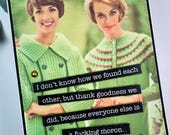 5 out of 5 starsI bought 3 different cards from this seller but I sat and LMAO at most of what's for sale. The cards are colorful and well made, plus I still laugh at them even though I've seen them at least 15 times. I've been trying to decide which card will go to which friend. The cards were packed up well and delivered on time. I love them! Thanks!