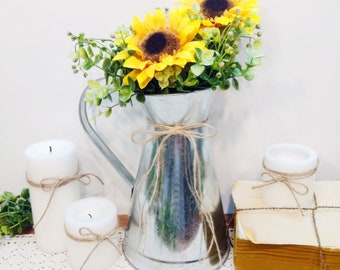Metal pitcher, Table centerpiece, Fall decor, wedding decor, Fall flowers, Rustic Autumn decor, Sunflowers, Daisies, Pitcher and flower