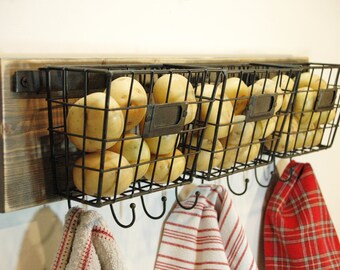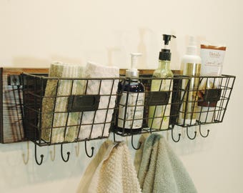 Farmhouse Style Wire Basket, Wire basket with hooks, Wall Decor, Farmhouse decor, Kitchen wall decor, Bathroom, Bedroom decor, wire basket