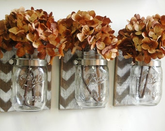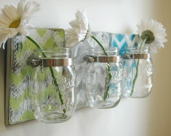 YOU PICK Chevron Wall Decor Trio Three Mason jars mounted on recycled wood shabby chic rustic wall decor