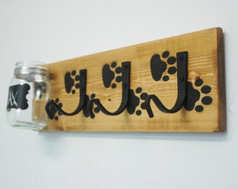 Pet Leash Holder, Pet Treat Holder, Dog leash hook, Dog leash holder, Farmhouse pet, paw prints, puppy gift, Dog treat container, pet hooks