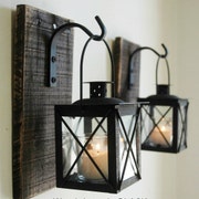 Black Lantern Pair (2) with wrought iron hooks on recycled wood board for unique wall decor, home decor, bedroom decor