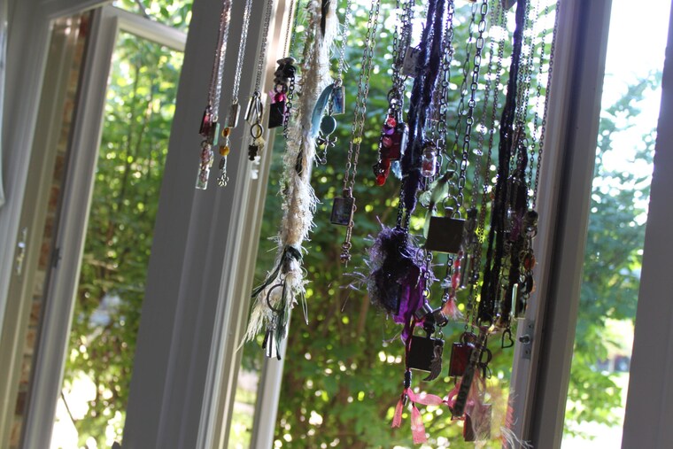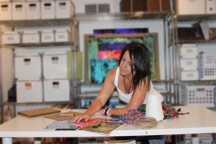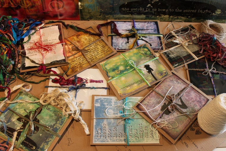 I love to experiment! Surveying my studio I find a plethora of supplies! India ink, spray dye, acrylics, watercolor, oil, pastels, chalk, crayons, pencils, markers, tissue paper, old school papers, old newspapers and magazines, copies of my journal, glitter, glue, structure gel, stencils, stamps, old jewelry, acrylic gemstones, embroidery floss, thread, colored wire, ribbon, beads, and bins of “stuff”! And then there is my digital world… Adobe Illustrator and Photoshop, an Epson printer and scanner and my constant companion, the trusty Canon SLR.