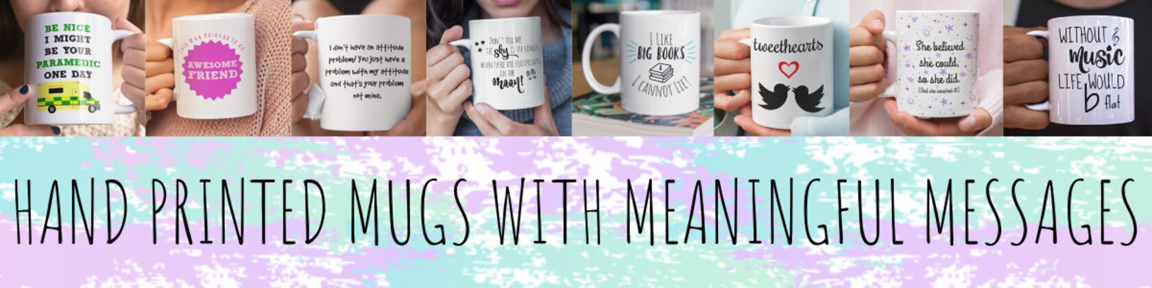 Handprinted, ceramic mugs designed with meaningful messages that are delivered all over the world! Designed and handprinted by me, at home in Warwickshire UK using the sublimation printing process.