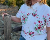 5 out of 5 starsI especially love this romantic, rose-strewn vintage tablecloth; it makes the prettiest blouse! I love the heavier weight of the fabric, the flattering cut, and the whole vintage aura. Very nicely and professionally made! Fast shipping and my package was very well wrapped. ♥️