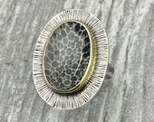 Estoy infinitamente intrigado y distraído por los "objetos brillantes": una concha intrincada en la playa o el misterio de un fósil formado en pirita por millones de años en la tierra. Me he convertido en un coleccionista de materiales inusuales y tengo un estudio lleno de roca áspera de todo el mundo (semipreciosas, gemas preciosas, fósiles) que me inspiran disponibles para cortar y pulir en cabujones terminados para joyas. Muchos de mis días los paso peinando Rehoboth Beach, DE en busca de tesoros oceánicos que aspiran a convertirse en joyas.